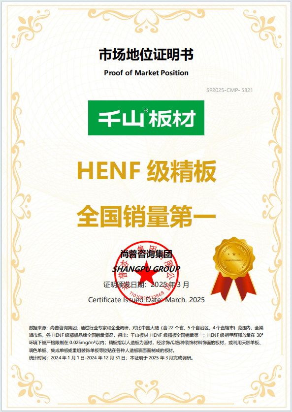 “見山·見未來”千山板材2025全國經銷商峰會,尚普咨詢集團曹頡先生親臨峰會現場,為千山板材帶來極具分量的權威認證——千山板材HENF級精板全國銷量第一!再次印證了千山板材在環保家居領域的領先地位。作為中國最具領導力和權威性的認證公司,尚普咨詢是中國最早成立的咨詢公司之一,也是首批取得國家統計局涉外調查許可資質