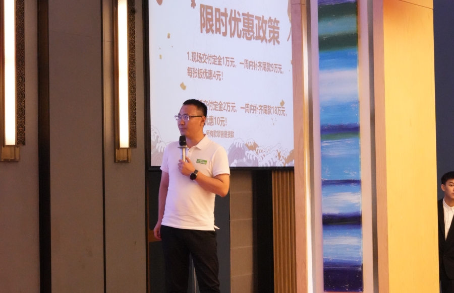 大會現場,滿經理對家具板招商政策進行詳細解讀。對于合作家具廠,千山將提供全方位的政策支持,包括樣冊支持、樣柜支持、區域保護、培訓支持、廣告支持、抖音扶持、訂單引流 ,積極助力市場開拓和產品推廣。