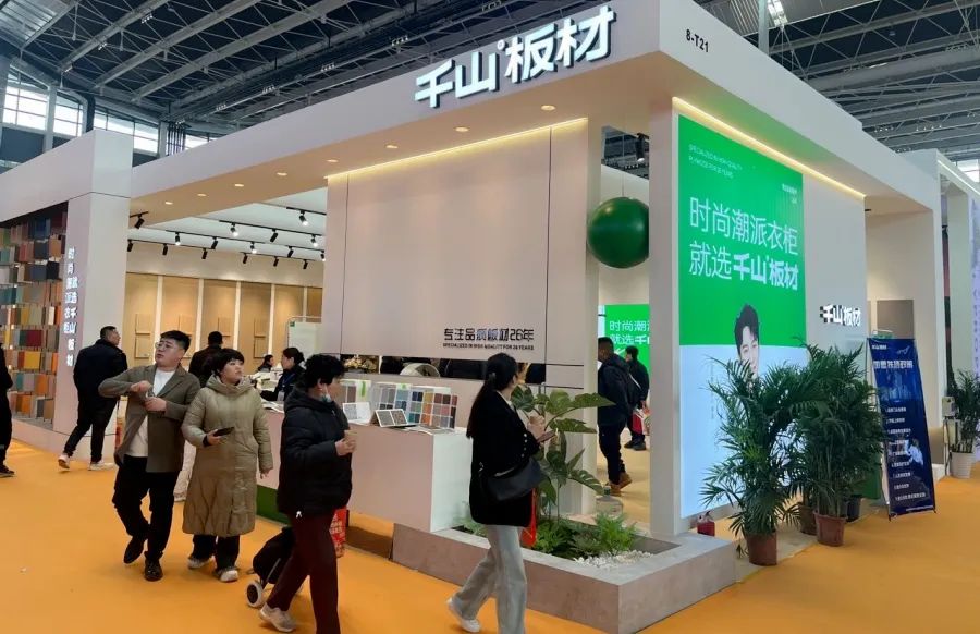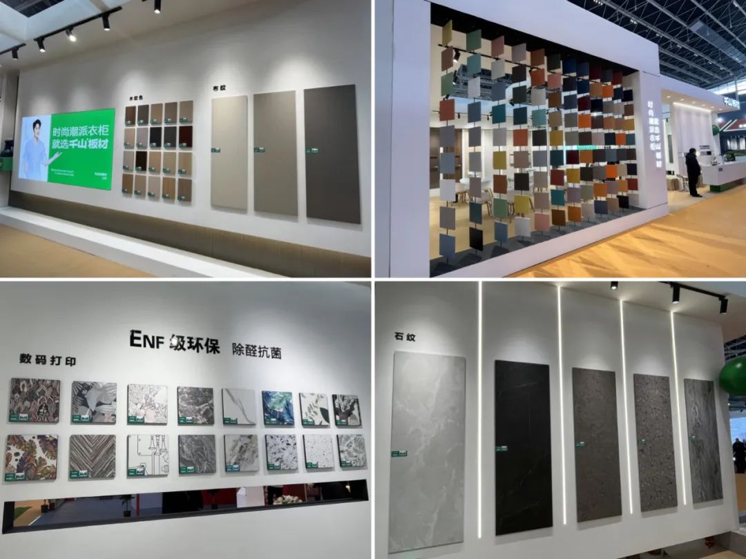 千山板材展臺設計布局開闊、動線自然,讓觀展客戶更加自由地參觀、體驗各品類板材產品。花色展示設計絢麗突出,搭配柔和的光感給人舒適的視覺體驗。