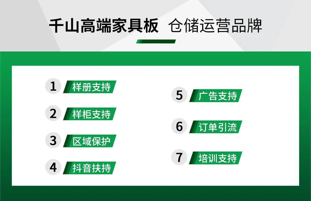 千山擁有完善的加盟體系,全國(guó)“一縣一代”火熱招商,更有樣冊(cè)支持、樣柜支持、區(qū)域保護(hù)、抖音扶持、廣告支持、訂單引流、培訓(xùn)支持7大政策支持,全方位助力經(jīng)銷(xiāo)商伙伴贏(yíng)戰(zhàn)終端市場(chǎng)。